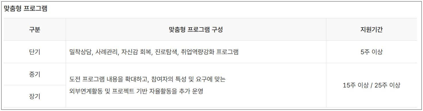 청년도전지원사업은 구직단념청년 등을 대상으로 맞춤형 프로그램(단기,중기,장기)을 제공하여 청년의 구직의욕 고취, 노동시장 참여 및 취업 촉진 지원을 하는 사업입니다.